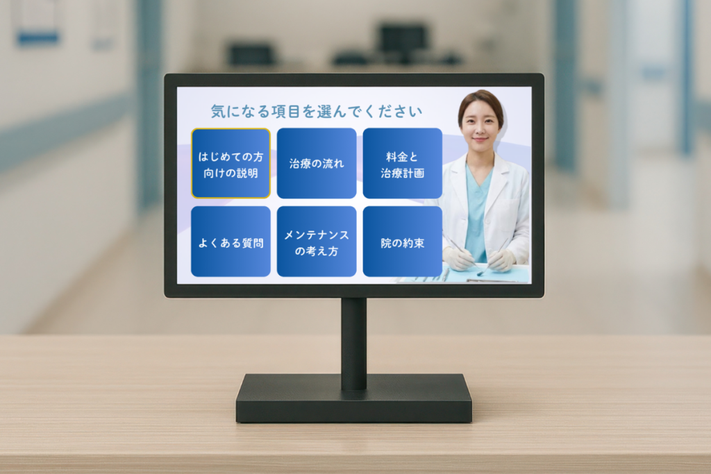 「読まされる」のではなく「自分で知る」から、納得感が深く残ります。「初めての方へ」の案内や、自費メニュー・予防の啓蒙など、院の想いを深く知ってほしい現場に。